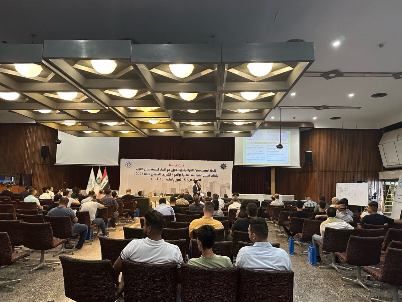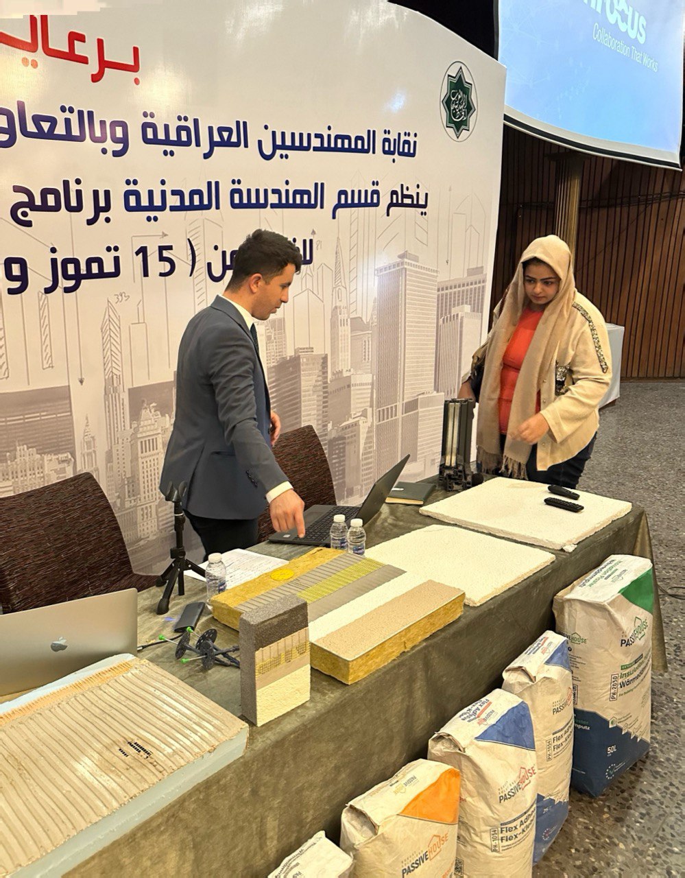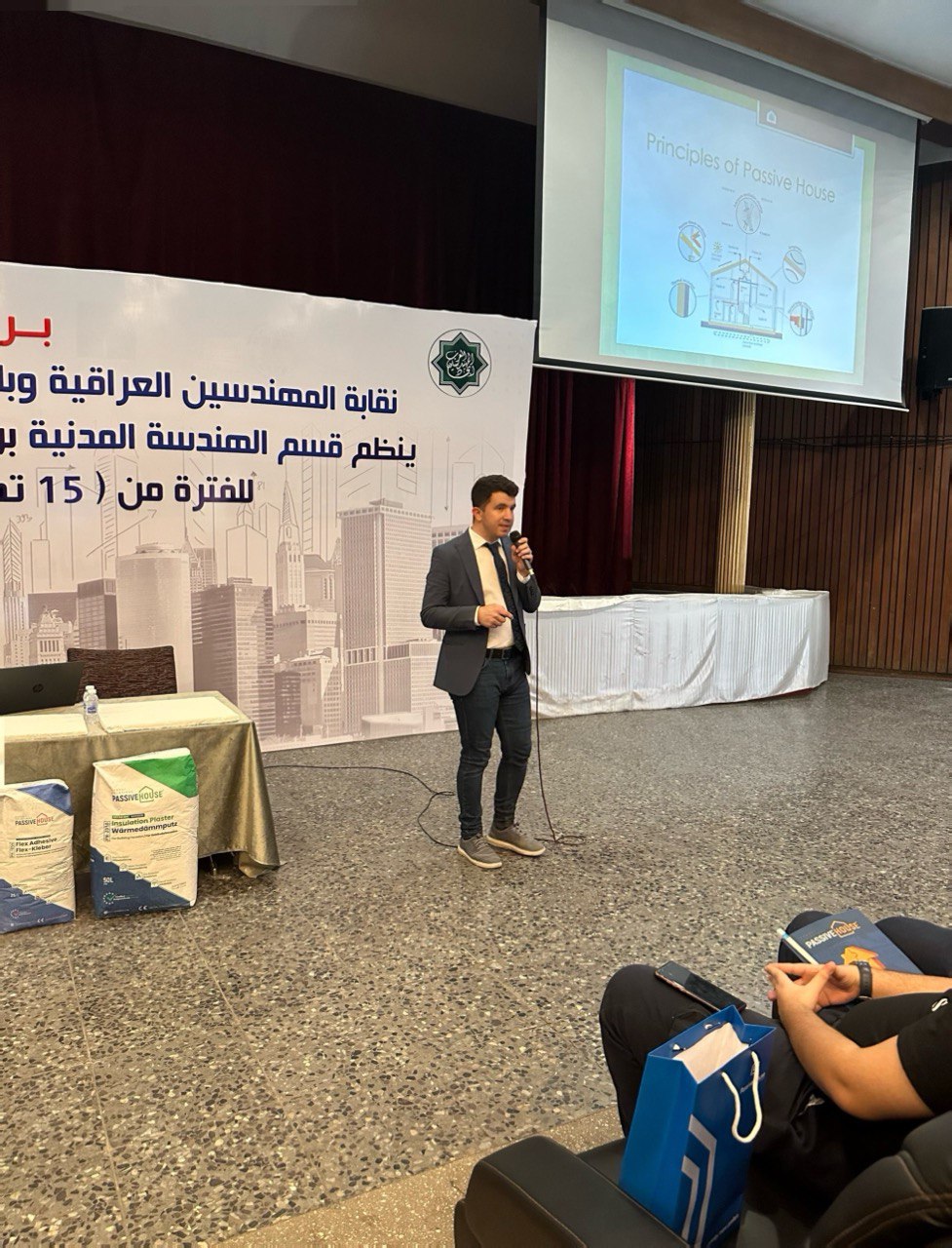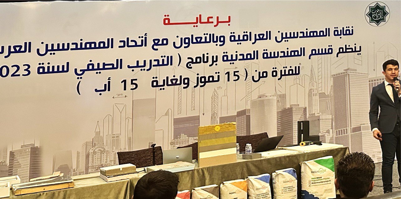 عرض ندوة للمهندسين والطلبة وخبراء البناء في بغداد، ركزت الندوة على كيفية حماية المباني من الحرارة الزائدة والتي تعتبر من أكبر المشاكل في صناعة البناء والتشييد في العراق، سيكون من الممكن أن نعيش حياة مريحة! ومع ذلك، أشارت ندوة اليوم إلى أن تنفيذ مبادئ باسیف هاوس يمكن أن يحل هذه المشكلة بسهولة.