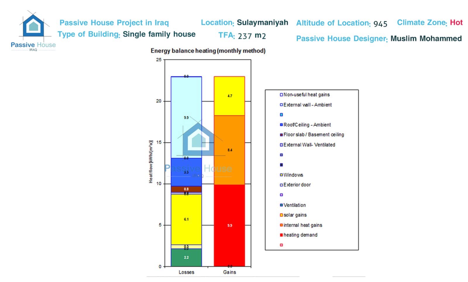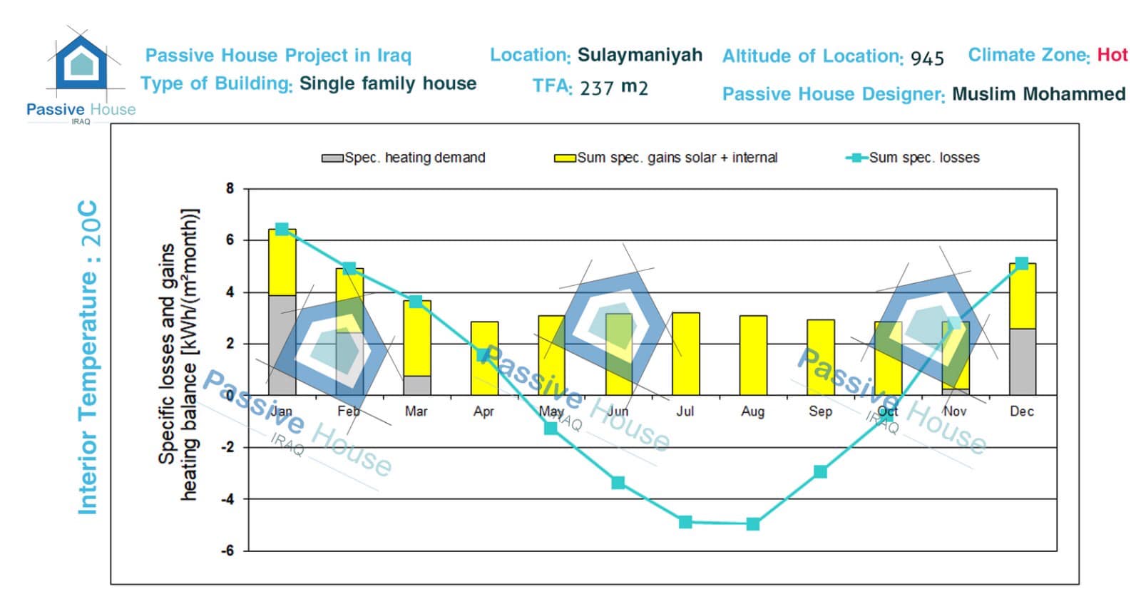 لە گەرمترین مانگی ئەمساڵدا ئەم پڕۆژەیەی پاسیڤ هاوس تەنیا 6.5kWh/m2 وزەی پێویست بووە بۆ فێنککردنەوە ! بەڵام خانووی ئاسایی پێویستی بە زیاتر لە 40kWh/m2 هەیە بۆ فێنککردنەوە.