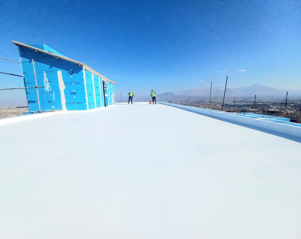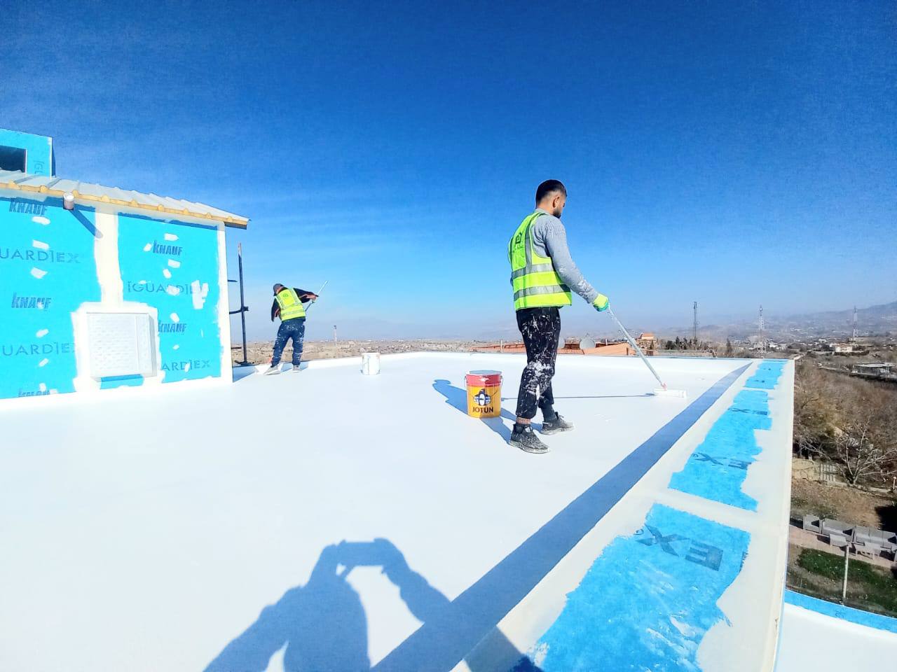 Apply a waterproofing system to the concrete roof of a building. By the system, we protect the roof from moisture, freezing, and also its radiation sunlight so it's protected from overheating.